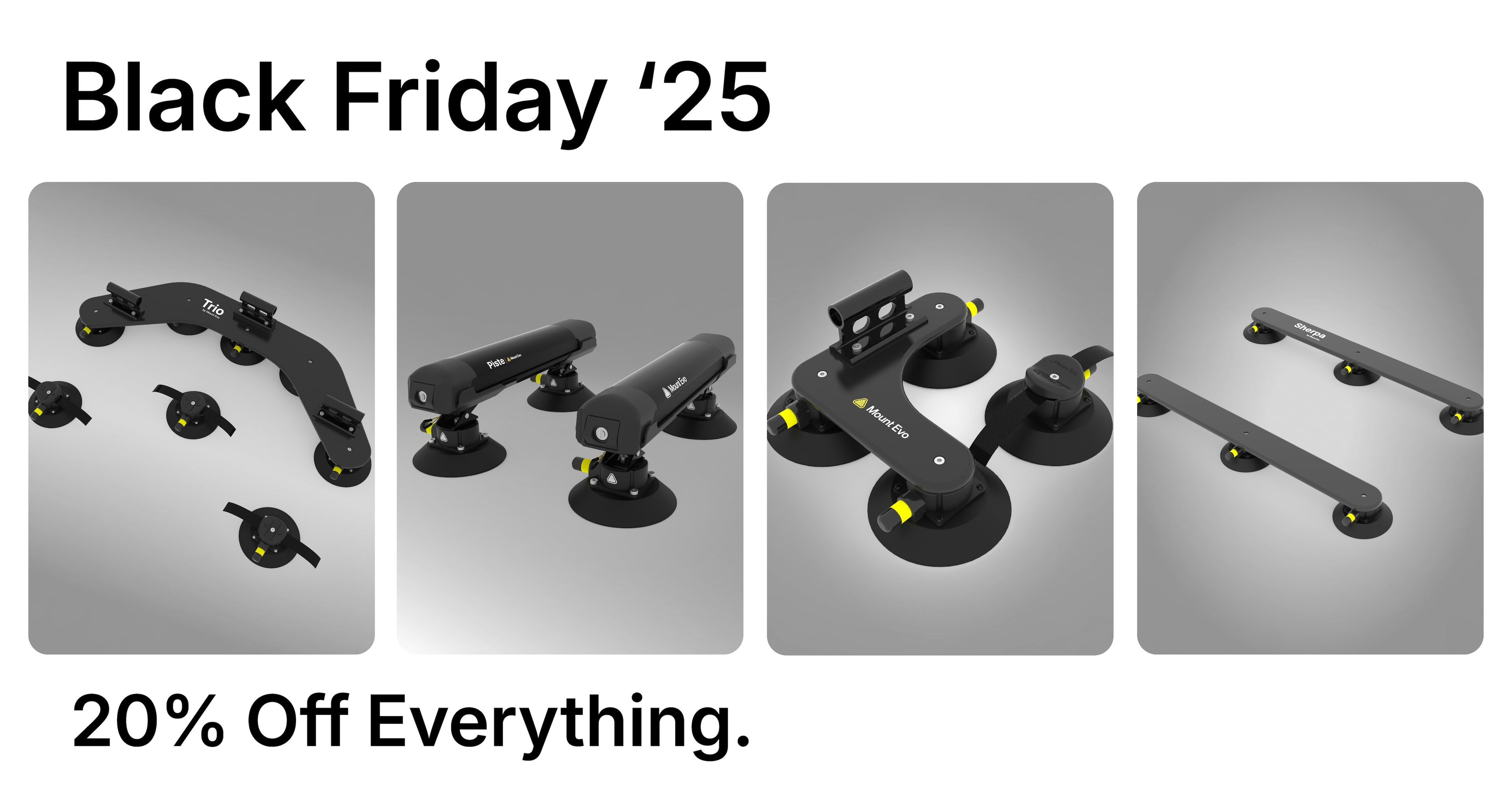 Mount Evo crée des supports sous vide modulaires innovants pour les sports que nous aimons. À l'aide de ventouses modulaires, nous avons conçu une gamme de supports pour le cyclisme, la neige et les sports nautiques . Nos supports universels peuvent être installés de manière transparente sur n'importe quelle voiture en quelques minutes seulement. Tous nos supports utilisent des ventouses modulaires qui peuvent être transférées d'un support à l'autre, donc une fois que vous avez l'un de nos supports, il est considérablement moins cher d'en acheter un autre. C'est idéal pour ceux d'entre vous qui, comme nous, font non seulement du vélo, mais aussi du surf et du ski.