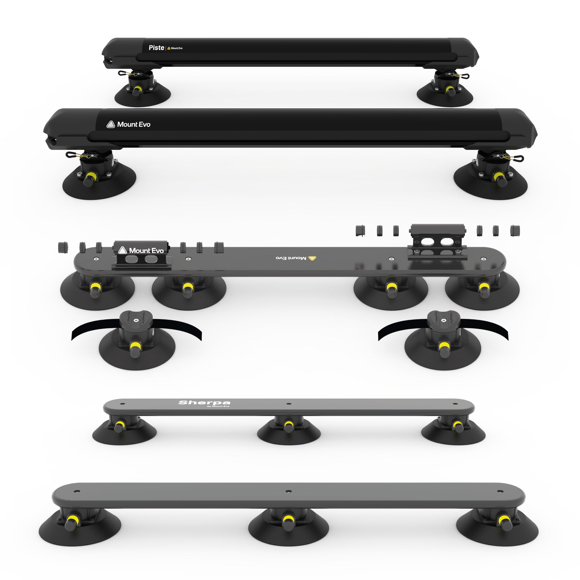 Le pack Piste + Sherpa + Duo est la solution de transport idéale pour les aventuriers qui aiment le ski, les sports nautiques et le vélo entre amis. Ce pack tout-en-un comprend le porte-skis et snowboards Piste , conçu pour transporter vos skis et snowboards en toute sécurité dans n'importe quelle voiture ; le porte-bagages Sherpa Carryall , idéal pour monter vos SUP et planches de surf ; et le porte-vélos Duo , pouvant accueillir deux vélos. Idéal pour ceux qui souhaitent passer sans problème des pistes enneigées aux vagues de l'océan et aux pistes cyclables. Ce pack comprend des bases modulaires pour Piste, Sherpa et Duo, ainsi que 6 ventouses.