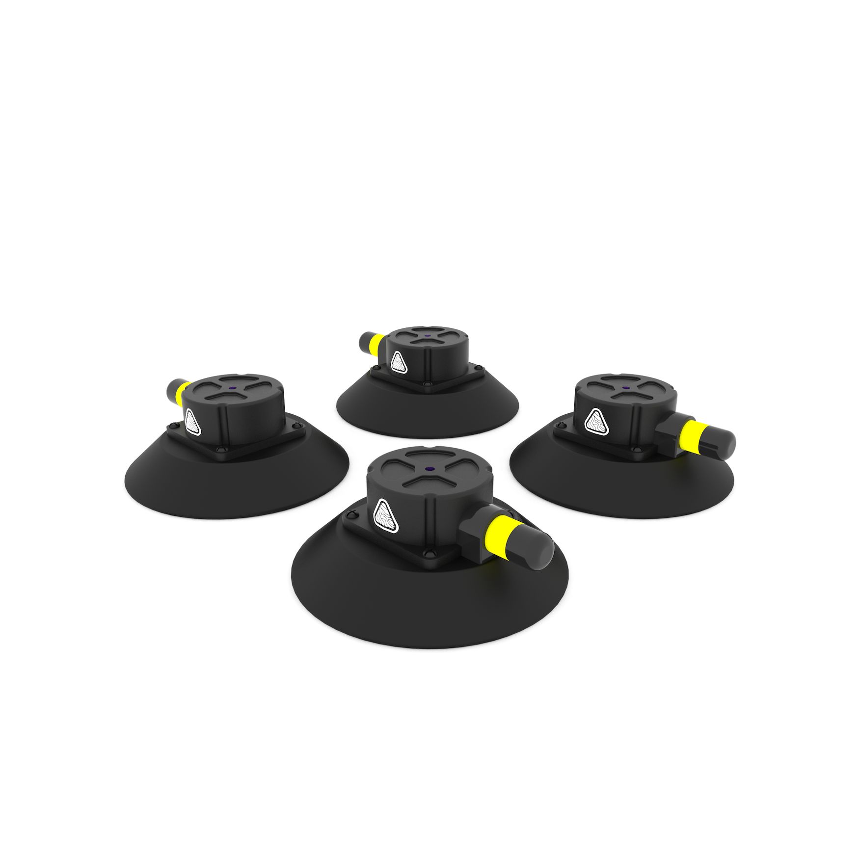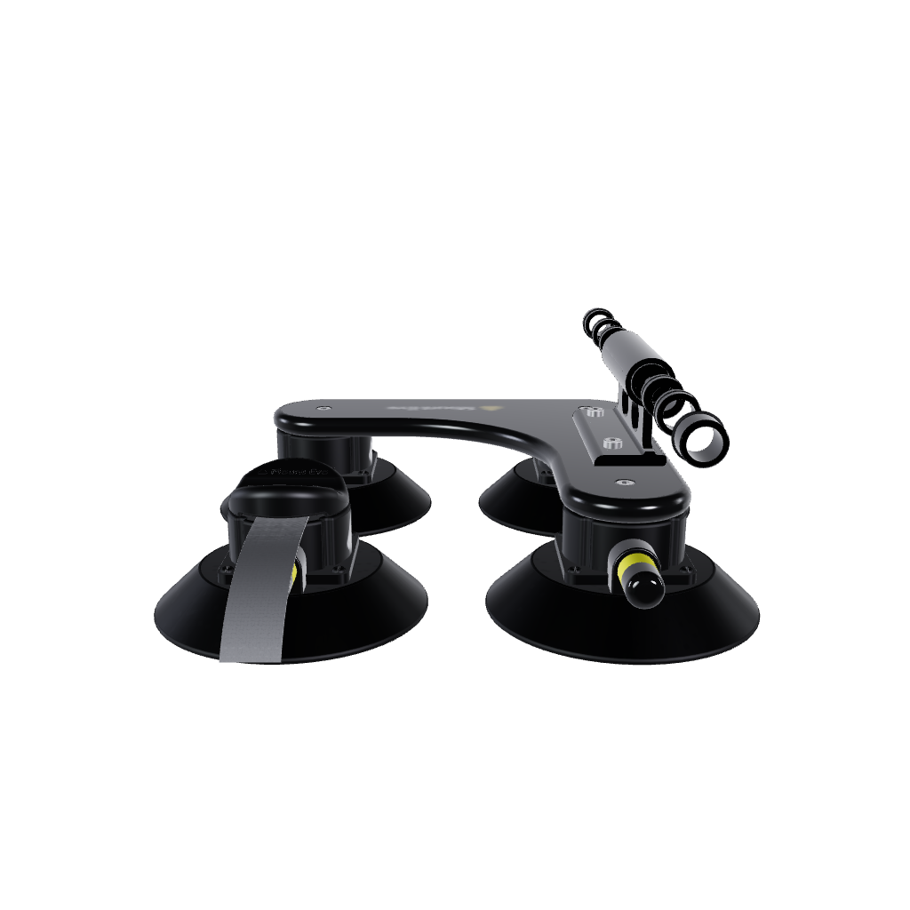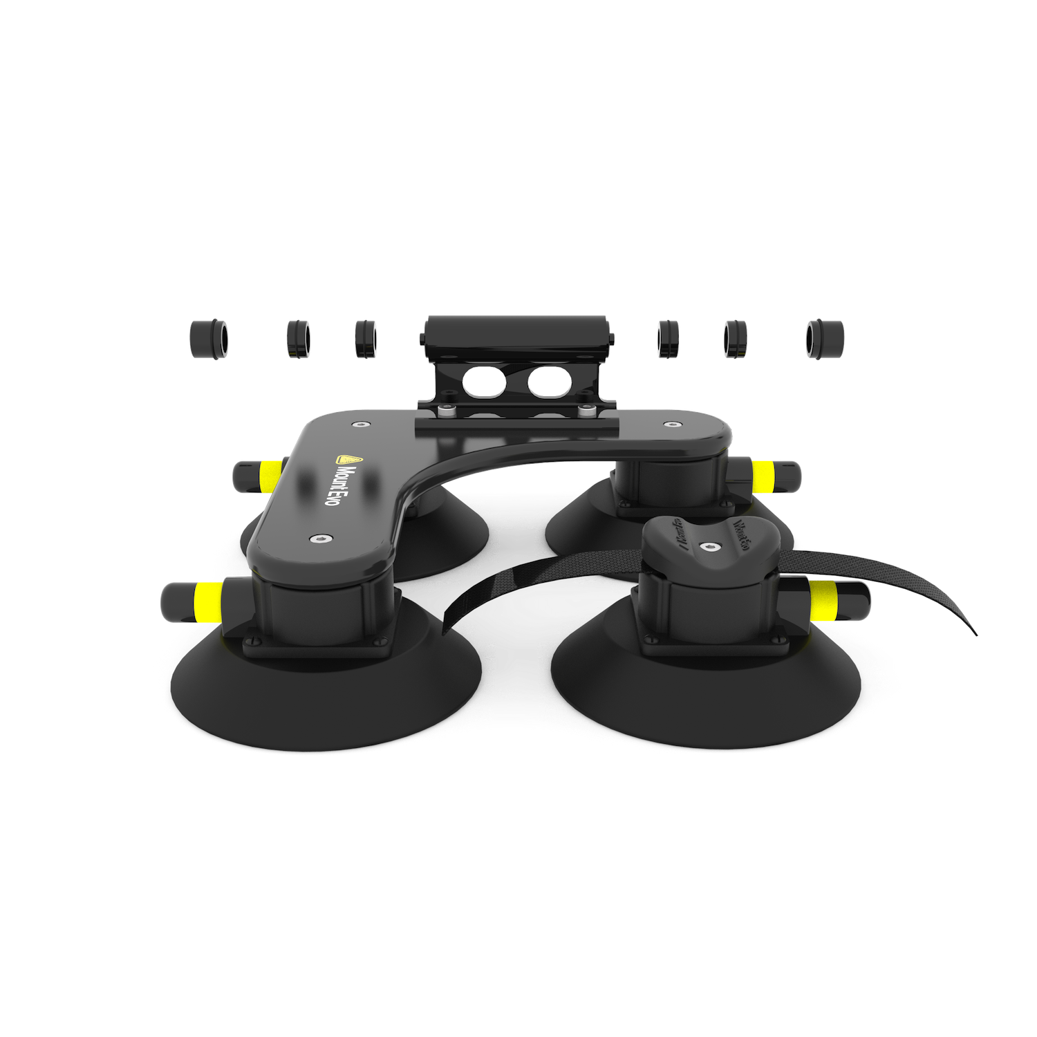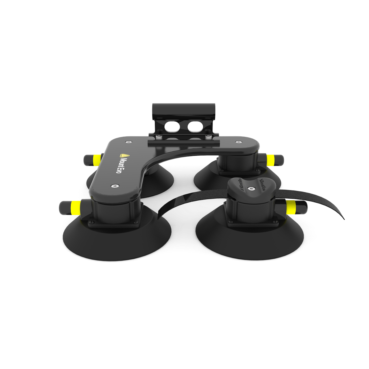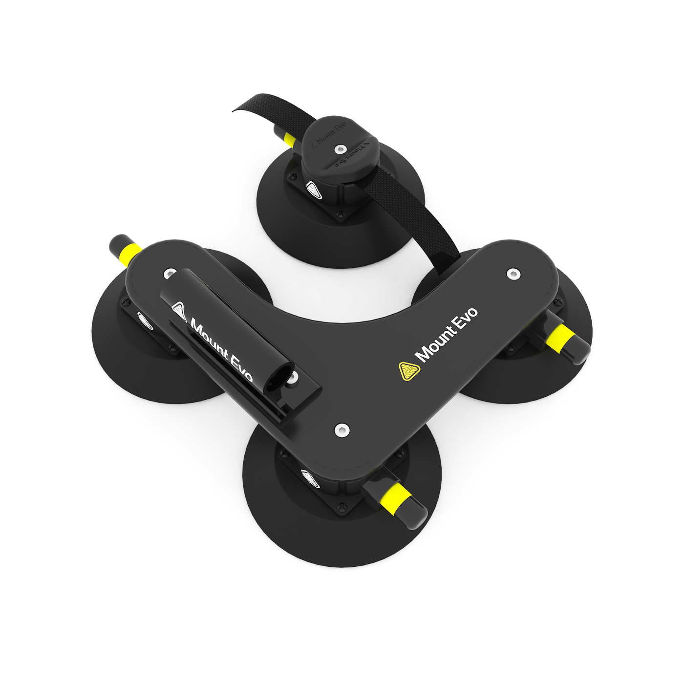 Funciona con ventosas industriales. Solo tiene más de 400 kg de fuerza de sujeción. Suficiente para sujetar boca abajo a un miembro del equipo Mount Evo.